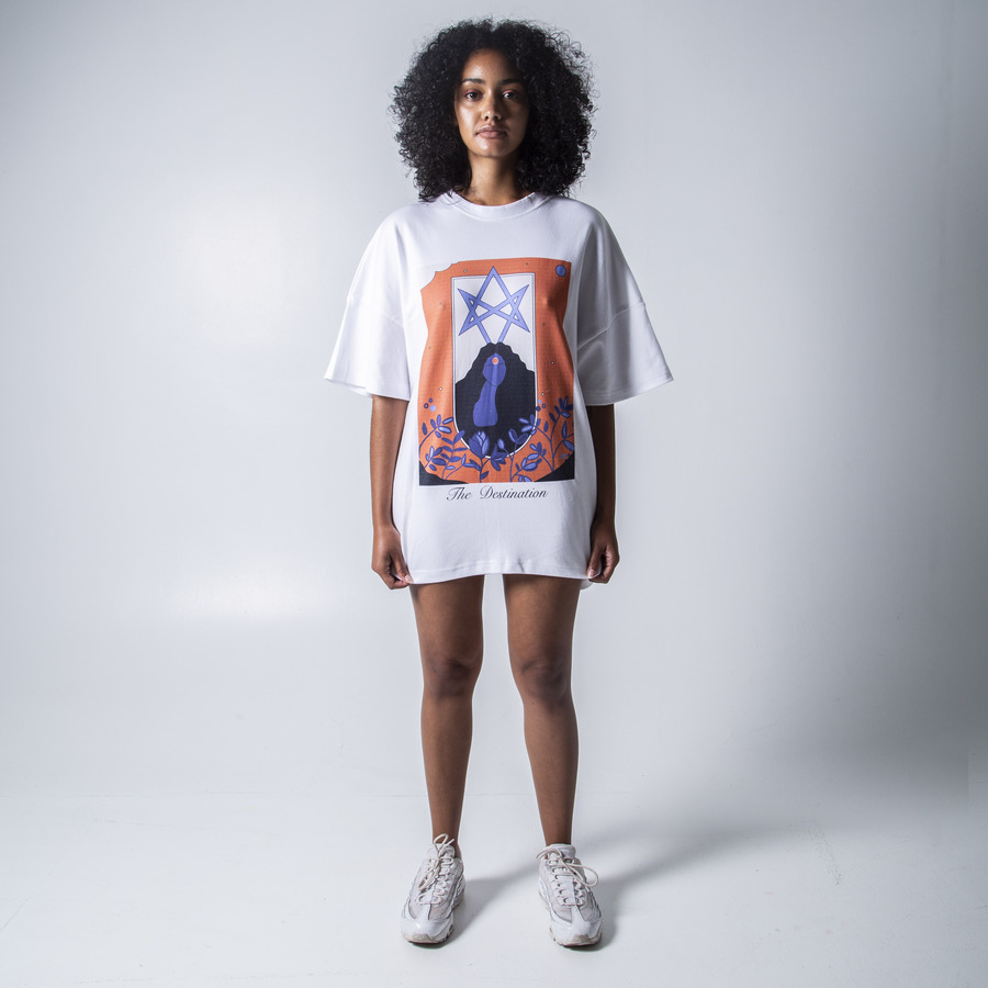 Loose fitted high neck t-shirt with “the destination” illustration print