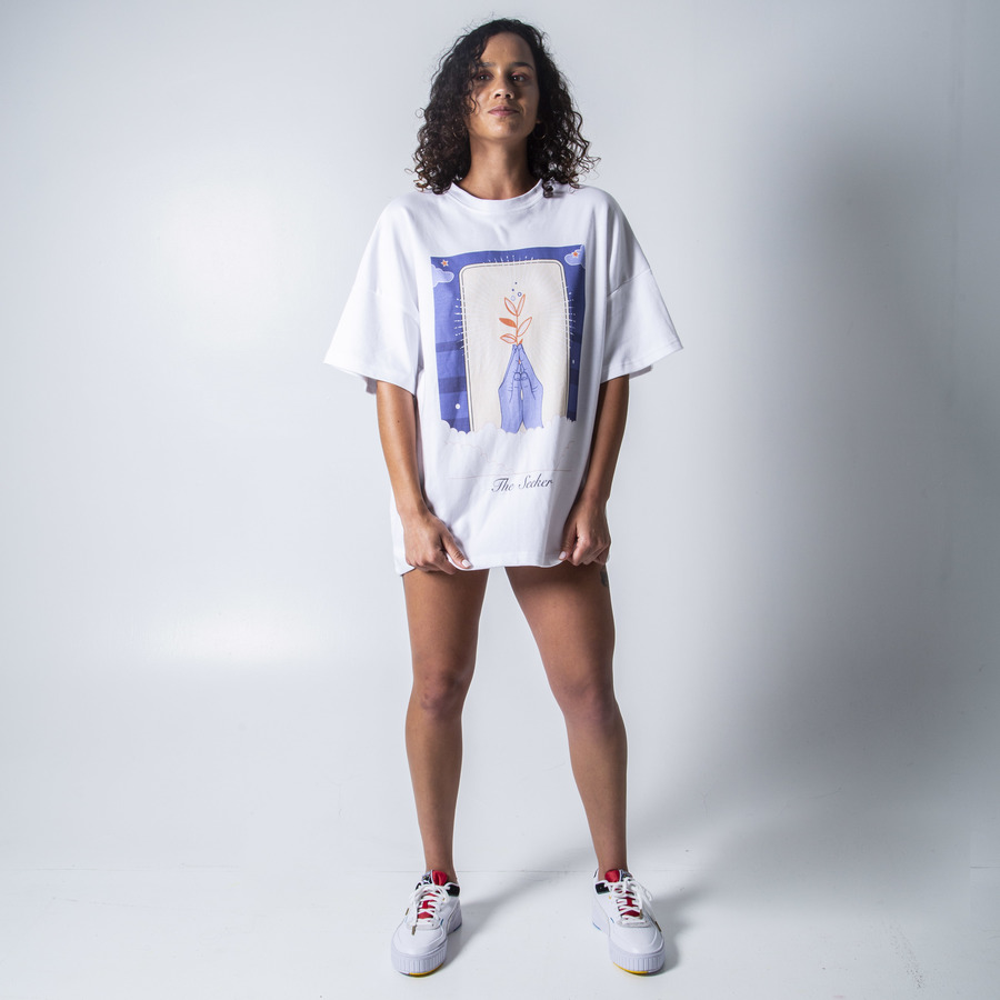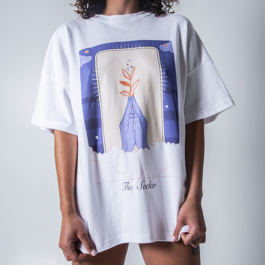 Loose fitted high neck t-shirt with “the seeker” illustration print